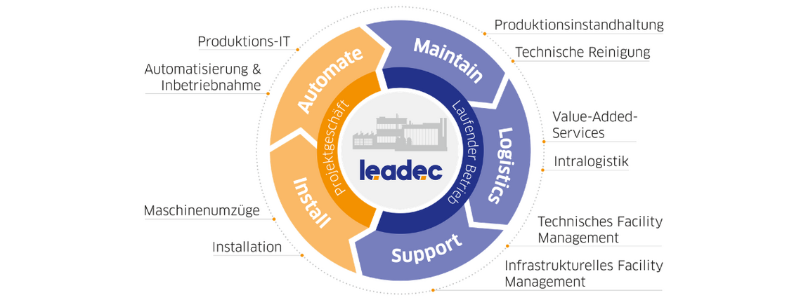 Leadec bietet ein umfassendes Portfolio zur Produktionsinstandhaltung – von präventiver Wartung und Inspektion über Störungsanalysen und Maschinenüberholung bis hin zu gesetzlich vorgeschriebenen Prüfungen und modernem Fluid- sowie Ersatzteilmanagement. Ergänzt wird das Angebot durch TPM- und Shopfloormanagement, Feldbustechnik sowie ein effizientes Tool- und Werkstattmanagement – alles abgestimmt auf höchste Sicherheits- und Qualitätsstandards nach DIN 31051.