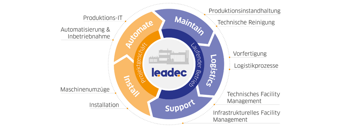 Leadec bietet ein umfassendes Portfolio zur Produktionsinstandhaltung – von präventiver Wartung und Inspektion über Störungsanalysen und Maschinenüberholung bis hin zu gesetzlich vorgeschriebenen Prüfungen und modernem Fluid- sowie Ersatzteilmanagement. Ergänzt wird das Angebot durch TPM- und Shopfloormanagement, Feldbustechnik sowie ein effizientes Tool- und Werkstattmanagement – alles abgestimmt auf höchste Sicherheits- und Qualitätsstandards nach DIN 31051.