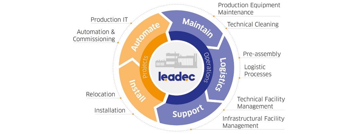 Industrial companies around the world rely on Leadec's expertise in complex processes in the smart factory, e-mobility and sustainable production and infrastructure. We build on more than 60 years of experience and never stand still. We offer our services from a single source at 350 locations on four continents. Often directly on site in the plants and facilities. Our customers see us as reliable partners, experienced experts and creative forward thinkers. This is because we listen, take responsibility, develop new ideas and invest a lot in order to keep improving: in the development of our organization, in the expertise of our 22,500 employees, in the digitalization of our processes and in constructive and trusting cooperation.